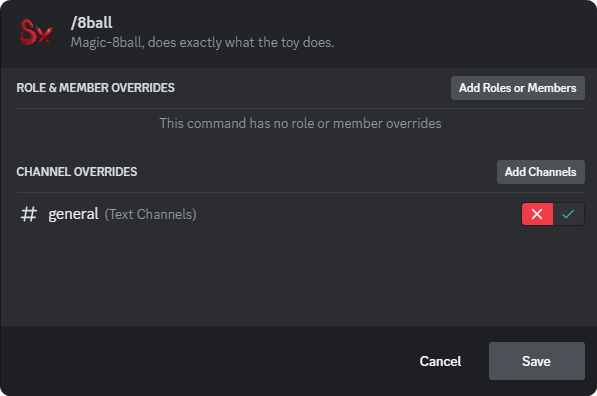 <figure><img src="https://3235107011-files.gitbook.io/~/files/v0/b/gitbook-x-prod.appspot.com/o/spaces%2FPR38BTXhzW04xdbh6h1o%2Fuploads%2FwWxDsfQ0nC5EQFlHkPal%2FDiscord_97Qapr5Syj.png?alt=media&#x26;token=f33a6aef-68be-449a-9eee-c84f6666e726" alt=""><figcaption><p>Allow or Restrict access to commands by roles, members, or channels.</p></figcaption></figure>