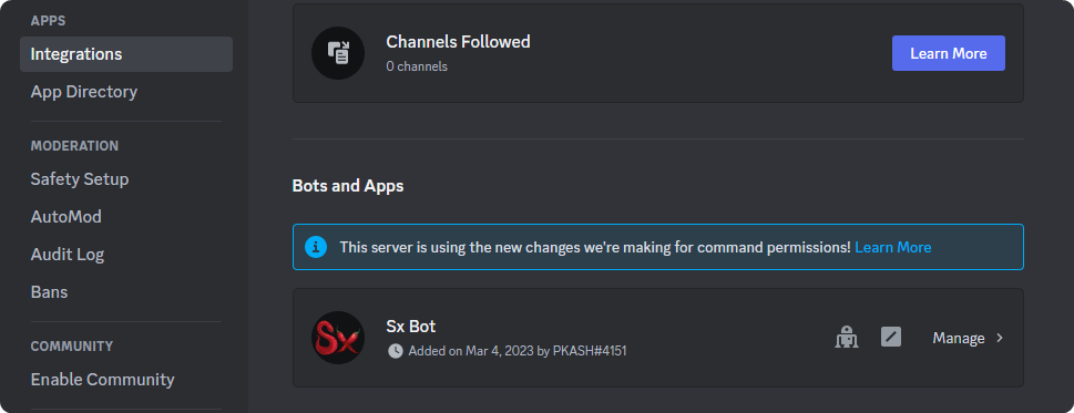 Sx Bot is using Discord's v2 command permission system, effective **February 28, 2023.** For more information on this, visit [Discord's command permissions](https://support.discord.com/hc/en-us/articles/4644915651095-Command-Permissions) page.