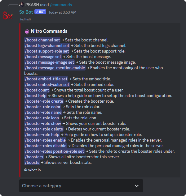 Type **`/commands`** to view a menu with the bot categories. From here, you can select your category of your choice which will display all commands in that category. Here is an example for the **Nitro Boost Tracking** category. You can then click on the command link directly to run it.